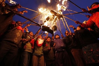 Supporters of Nepal’s Tarun Dal, the youth wing of Nepali Congress, light torches before a torch rally in Katmandu, Nepal, Sunday, Dec. 18, 2011. Tarun Dal, called for a general strike Monday to protest the death of their cadre Shiva Poudel Friday reportedly in an attack in Bharatpur jail two weeks back. (AP Photo/Niranjan Shrestha)