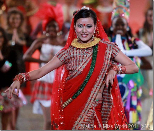 Although she couldn’t win any titles, Malina did an appreciable dance in traditional Nepali attire. Malina danced to a Nepali song, Makhmali Choli, in the Miss World 2011 contest, held in London, UK. Malina looked awesome in traditional Nepali dress comprising of sari, Dhaka choli and accessories.